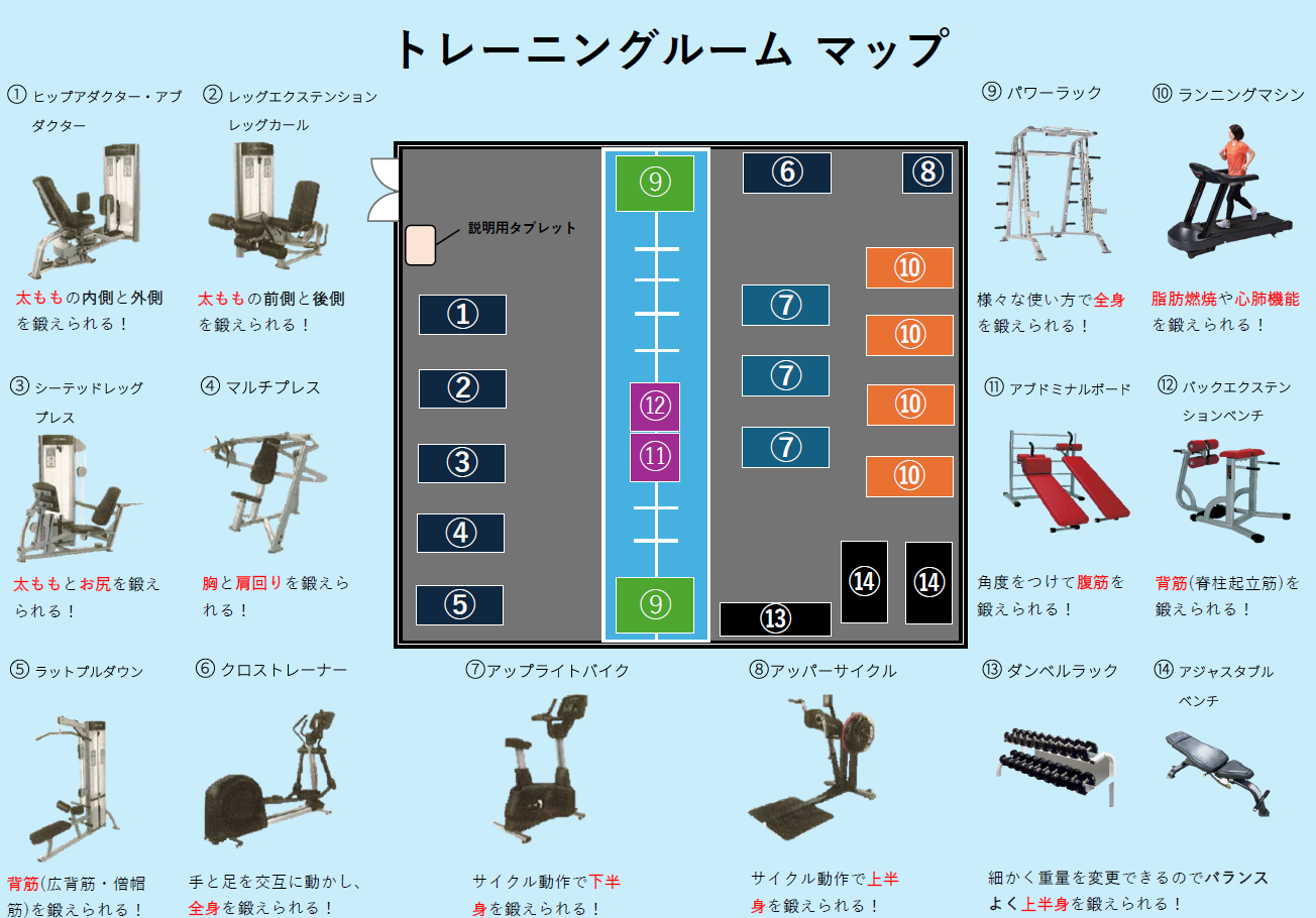 | 施設概要 | 【トレーニングルーム大】 【トレーニングルーム小】 ・バランスボール ・バランスディスク ・ミニダンベル ・フォームローラー ・メディシンボール ・ウォーターバック New!! その他「血圧計」「体組成計」あります。 ※トレーニングルームのご利用は高校生以上からとなりますので、ご了承下さい。 |